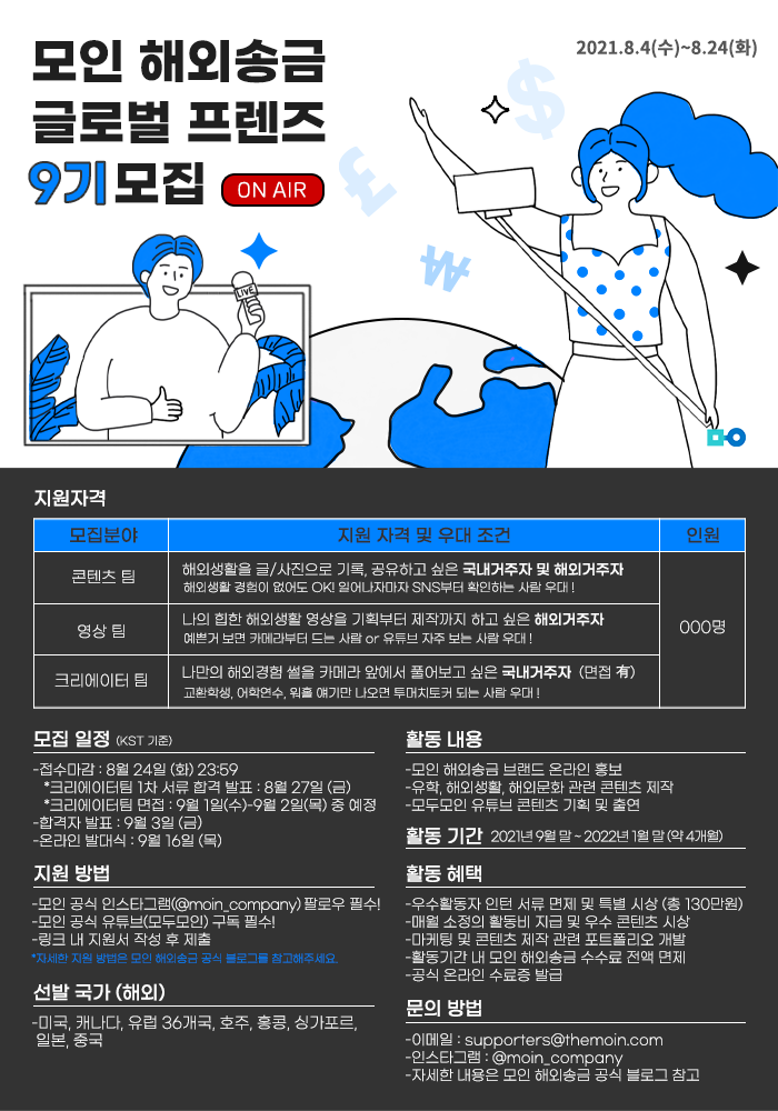 [모인서포터즈] 해외송금앱 MOINㅣ모글즈 11기 모집안내 안녕하세요 여러분~~모인서포터즈 모집소식이 있어서 바로 소개해드리도록 하겠습니다! 2년 전 프랑스 교환학…blog.naver.com