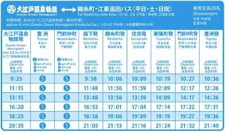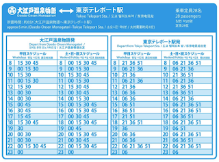 오에도 온천 픽업 시간표, 타는 방법 오에도 온천에는 보통 셔틀 버스를 많이 이용합니다. 셔틀버스 노선이 다양하니 자신의 동선에 맞는 시간을 선택하세요. 도쿄 역, 니나가와 역의 네 가지 노선이 있는 것입니다.오에도온천 셔틀 시간표